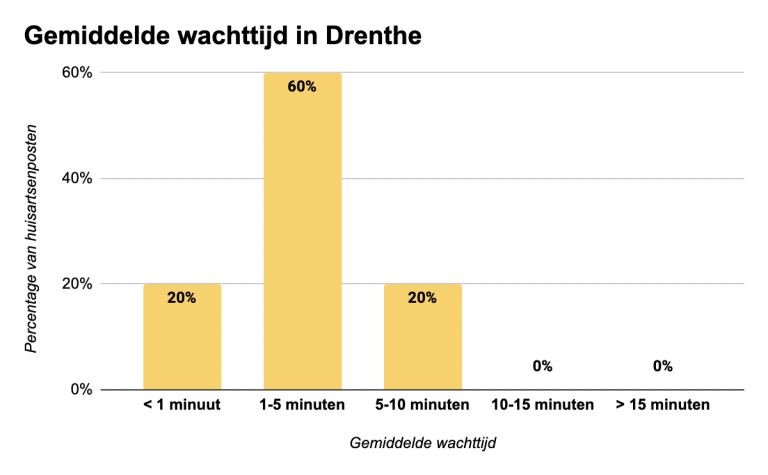 De gemiddelde wachttijd voor de huisartsenpost is 2,5 minuut in Drenthe, 2 minuten in Zeeland en een 1,5 minuut in Groningen.Langste wachttijden in Noord-Brabant, Noord-Holland en Zuid-Holland